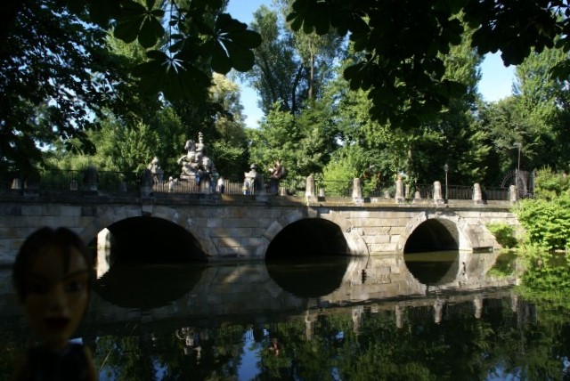 Bridge and statue, view from park