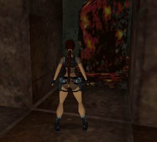 Pull out of the water, head carefully to the right of the debris to avoid a large sword that drops from the ceiling if you head into the middle. Head west along the right side of the room and walk over the light coloured broken blocks. Angle to face south/west and run over the broken blocks in the middle and far corner of the room. Head north, drop into a small room, run over the broken blocks to open the door in the east wall. Head through the winding corridor and pull the pushblock out. Climb over the block and push the wall switch to open a door behind lava in another room. Exit and follow the right side of the room around to a room on the right. Pickup the FLARES in the north/west corner by the plant and head to the east side of the room. Take a running jump over the lava through the newly opened door. Angle to face north/east, take a running jump over the lava with a slight curve and grab the crevice in the north wall. Shimmy left, around the corner and drop. Shoot the vase and pickup the KEY. Take a running jump through the opening south/east and a running jump through the door over the lava west. Use the key in the lock south/east and head through the 1st door to trigger a 2nd door in the south wall. Head through that door to trigger a 3rd door and head through that door to trigger a 4th door. Head through that door to trigger a 5th door in the middle of the south wall. Head through the 5th door and slide down into a new area.